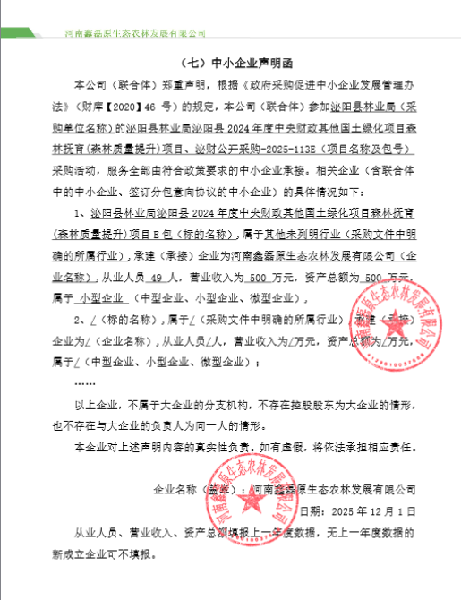 1 ******林业局泌阳县2024年度中央财政其他国土绿化项目森林抚育(森林质量提升)项目 E 包 详见招标文件 合格,符合国家及行业标准 20 日历天 合格,符合国家及行业标准
