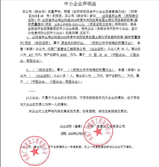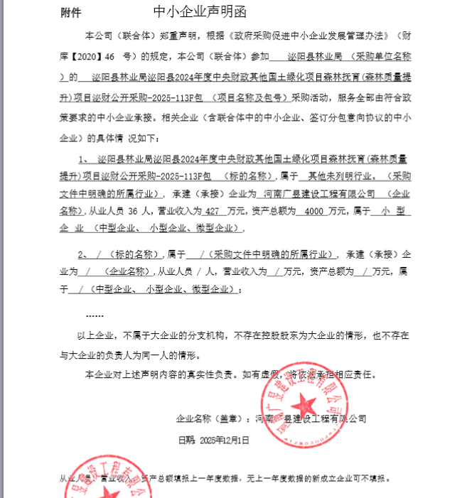 1 ******林业局泌阳县2024年度中央财政其他国土绿化项目森林抚育(森林质量提升)项目 N 包 详见招标文件 合格,符合国家及行业标准 20 日历天 合格,符合国家及行业标准