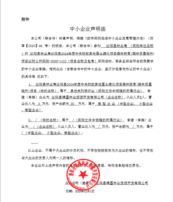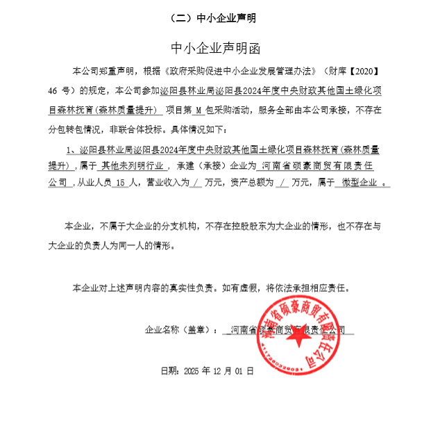 1 ******林业局泌阳县2024年度中央财政其他国土绿化项目森林抚育(森林质量提升)项目 M 包 详见招标文件 合格,符合国家及行业标准 20 日历天 合格,符合国家及行业标准
