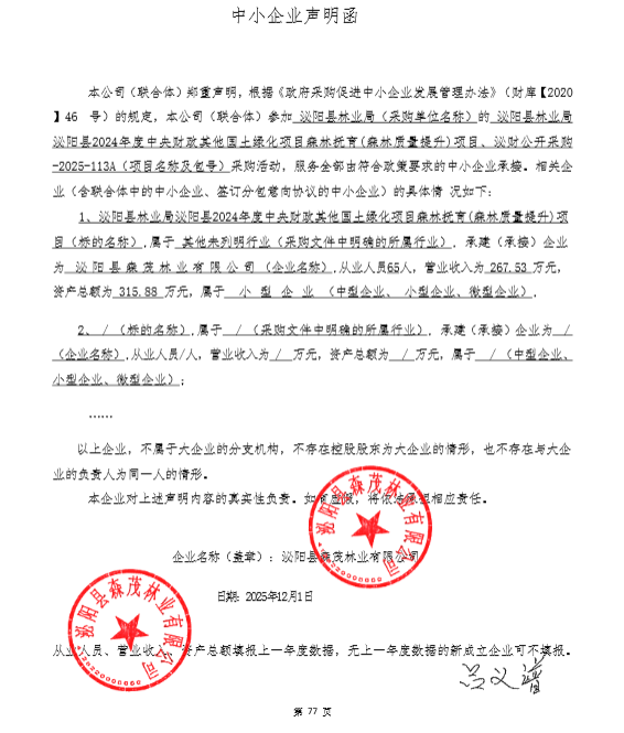 1 ******林业局泌阳县2024年度中央财政其他国土绿化项目森林抚育(森林质量提升)项目 H 包 详见招标文件 合格,符合国家及行业标准 20 日历天 合格,符合国家及行业标准