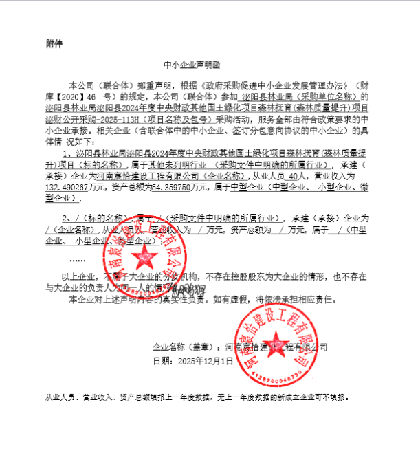 1 ******林业局泌阳县2024年度中央财政其他国土绿化项目森林抚育(森林质量提升)项目 B 包 详见招标文件 合格,符合国家及行业标准 20 日历天 合格,符合国家及行业标准